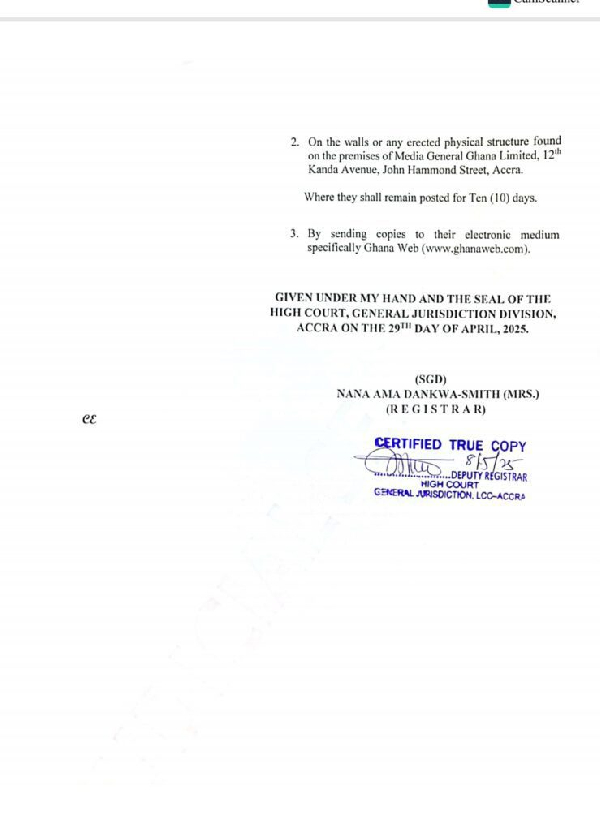 The order, dated May 8, 2025, was signed by a Deputy Registrar of the General Jurisdiction Division of the High Court in Accra.