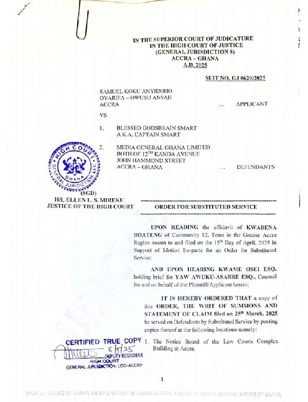 Per a ruling by an Accra High Court on Tuesday, April 29, 2025, granting an application for substituted service in the GHS 5 million defamation suit brought against Captain Smart and his employers, Media General, by Samuel Koku Anyidoho, an official court order has been issued.