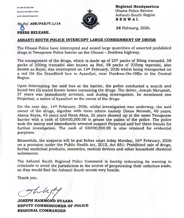 Addressing the media at Bekwai on Monday, February 16, 2026, the Ashanti South Regional Police Commander Joseph Hammond Nyaaba said the operation, carried out on February 13, 2026, resulted in the seizure of 257 packs of Tramadol and 58 packs of Tapentadol, popularly known as “Royal.”