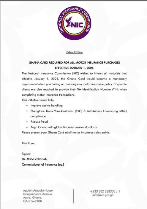 “The National Insurance Commission (NIC) wishes to inform all motorists that effective January 1, 2026, the Ghana Card would become a mandatory requirement when purchasing or renewing any motor insurance policy. Corporate clients are also required to provide their Tax Identification Number (TIN) when completing motor insurance transactions,” the statement said.