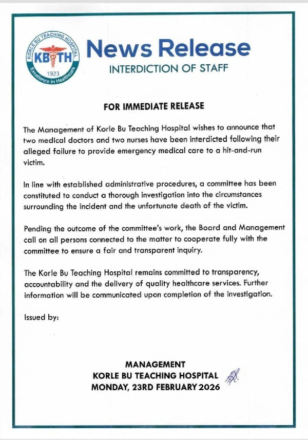 “The Management of Korle Bu Teaching Hospital wishes to announce that two medical doctors and two nurses have been interdicted following their alleged failure to provide emergency medical care to a hit-and-run victim.