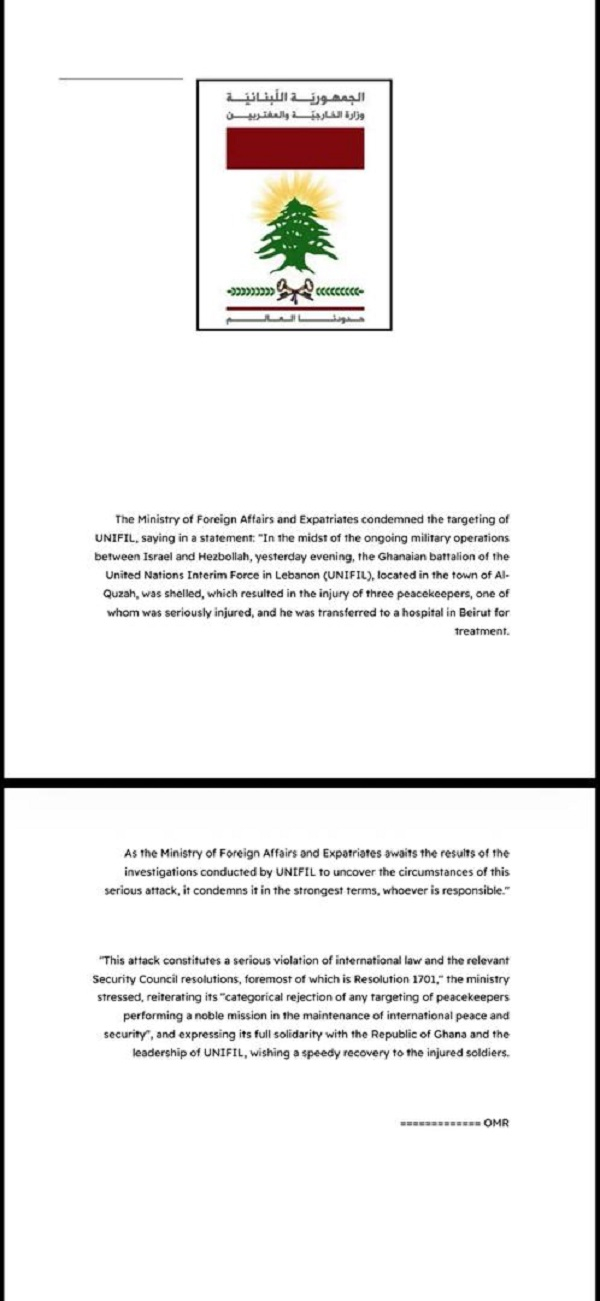 Lebanon expressed solidarity with the government and people of Ghana as well as the leadership of UNIFIL, while wishing the injured soldiers a speedy recovery.