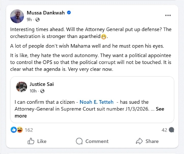 “Interesting times are ahead. Will the Attorney General mount a defense? The orchestration is more intense than apartheid. Many people do not wish Mahama well, and he must stay vigilant. It seems they despise the word 'autonomy.' They want a political appointee to control the OSP, preventing the prosecution of political corruption. The agenda is clear — very, very clear,” he stated on Facebook.