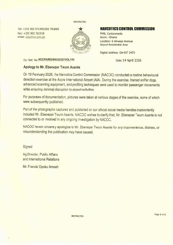 The apology was signed by Francis Opoku Amoah, Acting Director of Public Affairs and International Relations at NACOC.