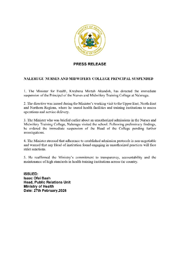 According to a press release dated February 27, 2026, the directive came during the minister’s working visit to the Upper East, North-East, and Northern Regions, where he inspected health facilities and training institutions to assess operations and service delivery.