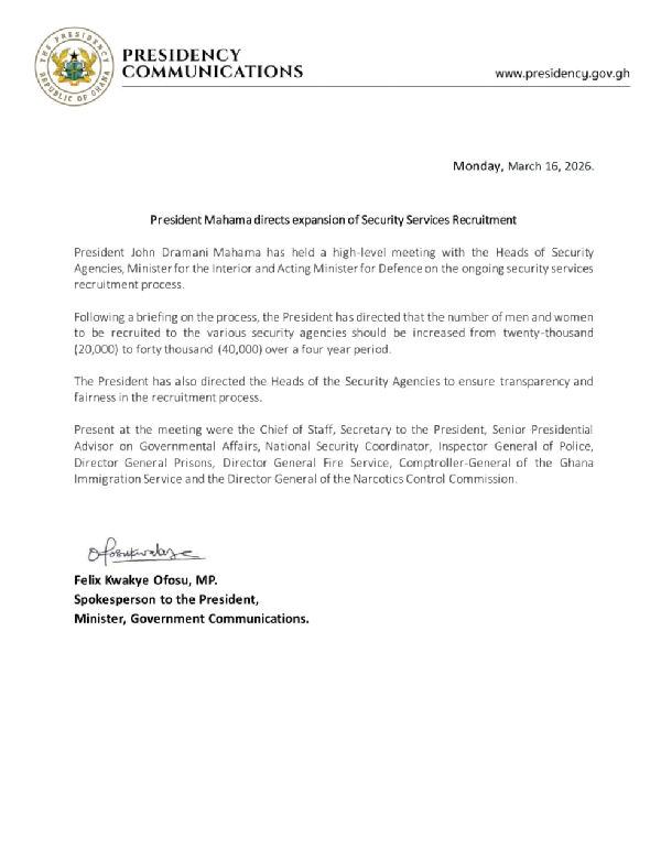 President John Dramani Mahama has directed a doubling of the security services recruitment target, ordering that the number of new recruits across Ghana's security agencies be increased from 20,000 to 40,000 over a four-year period.