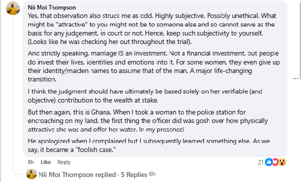 “I think the judgment should have ultimately be based solely on her verifiable (and objective) contribution to the wealth at stake. But then again, this is Ghana. When I took a woman to the police station for encroaching on my land, the first thing the officer did was gosh over how physically attractive she was and offer her water. In my presence! He apologized when I complained but I subsequently learned something else. As we say, it became a ‘foolish case’,” he added.