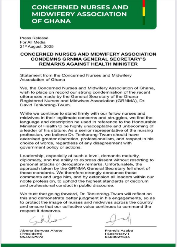 The statement, signed by CNMAG President Abena Serwaa Akoto and Secretary Francis Asaba, further underscored the need for leaders, especially those representing the nursing and midwifery profession, to be diplomatic and mature in expressing their grievances, and to do so without resorting to personal attacks.