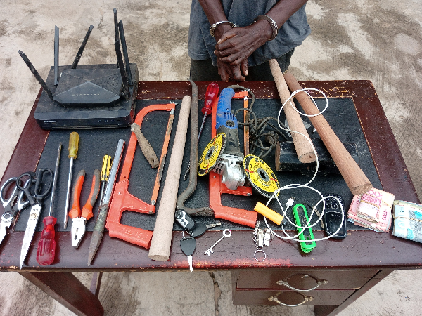 During the arrest, police retrieved a sack containing several tools believed to have been used in the criminal acts. These included hacksaw blades, a hammer, metal punch, screwdrivers, crowbar, assorted keys, pliers, scissors, a grinding machine with grinding wheels, wooden hammer handles, a keypad mobile phone, and cash amounting to GH¢9,133.00.