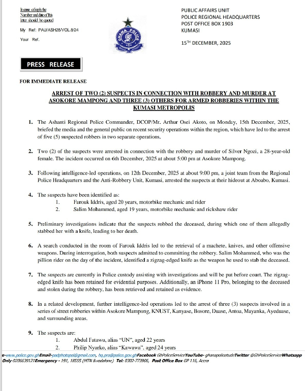 Detailing the incident, the police stated that the victim, identified as Silver Ngozi, a resident of Asokore Mampong, was brutally attacked during a robbery when one of the arrested suspects stabbed her with a knife.