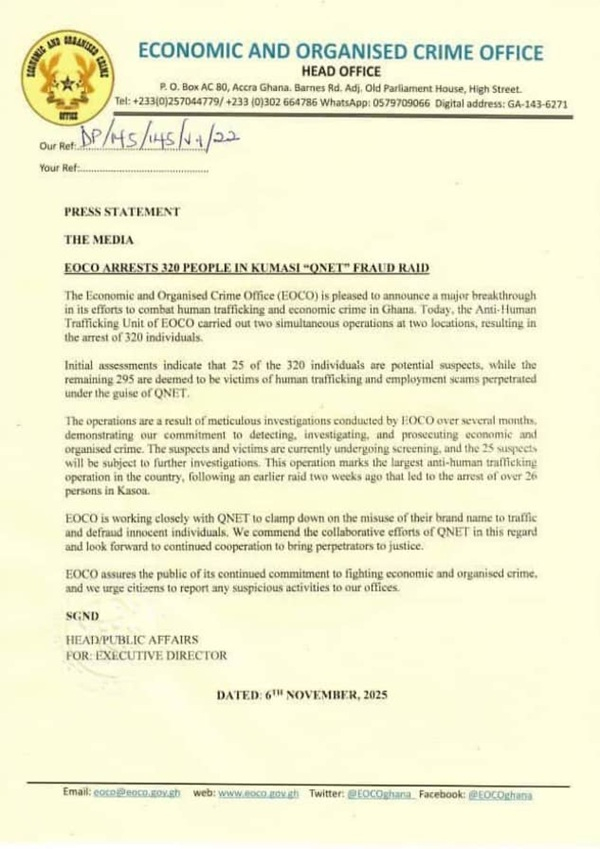 According to the statement, the raid led to the arrest of 320 persons, 25 of whom are potential suspects, while the remaining 295 are believed to be victims of human trafficking and employment scams perpetrated under the guise of QNET.