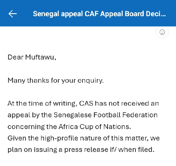 “At the time of writing, CAS has not received an appeal from the Senegal Football Federation concerning the Africa Cup of Nations. Given the high-profile nature of this matter, we plan to issue a press release if and when it is filed,” the court stated in response to a mail inquiry by sports journalist Muftawu Nabila Abdulai.