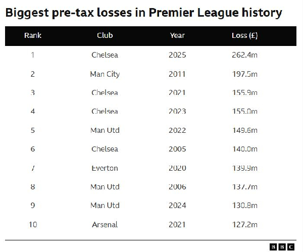 The £262m deficit for 2024-25 eclipses the £197.5m lost by Manchester City in 2011.