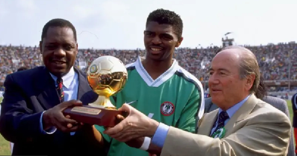 Kanu receive im 1999 African Footballer of di Year trophy for Afcon 2000, but e later experience heartbreak for final dat year