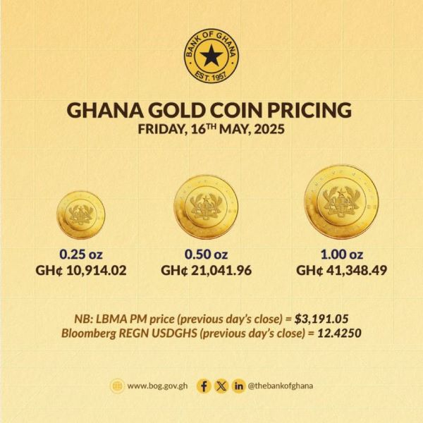 - The 0.25 oz coin is now selling at GH¢10,914.02, down from GH¢10,937.14 on May 16;