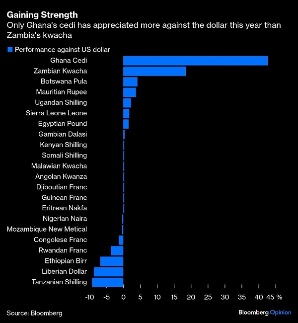 The report indicates that the cedi has appreciated more against the U.S. dollar this year than Zambia’s kwacha, registering a 42.7% gain, compared to the kwacha’s 18.5%.