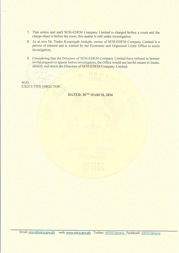 “As at now, Dr. Tanko Kwamigah-Atokple, owner of SESI-EDEM Company Limited, is a person of interest and is wanted by the Economic and Organised Crime Office to assist with the investigation,” the statement said.