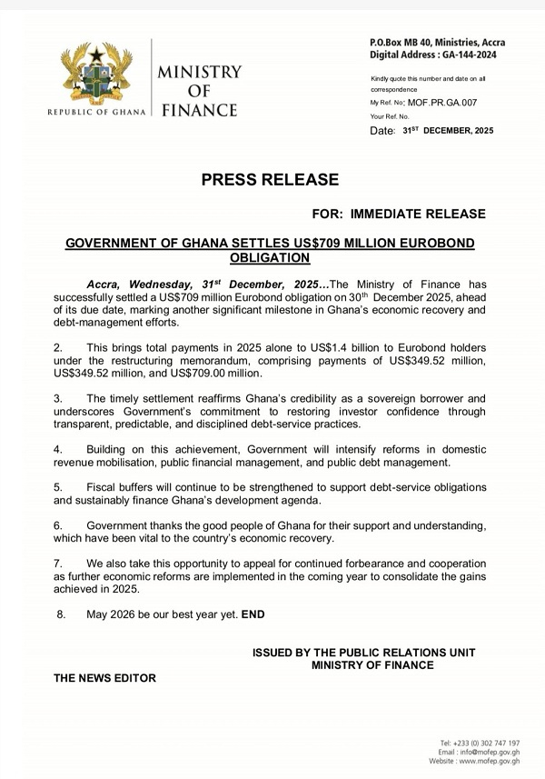 The Government of Ghana has settled a US$709 million Eurobond obligation, completing the payment on December 30, 2025, ahead of schedule.