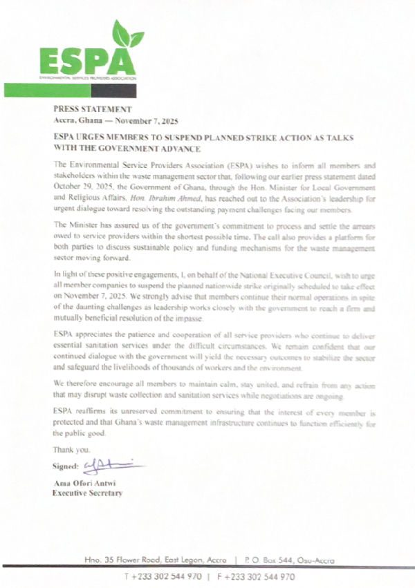 The Environmental Service Providers Association (ESPA) has urged its members to suspend their planned nationwide strike following positive engagements with the government over unpaid arrears.