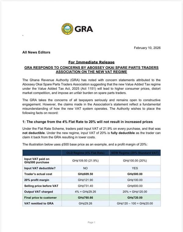 In a press statement sighted by GhanaWeb Business on February 10, 2026, and issued by its Communication and Public Affairs Department, the Authority responded to concerns raised by the Abossey Okai Spare Parts Dealers Association, which argued that the VAT changes under the Value Added Tax Act, 2025 (Act 1151), could place an extra burden on traders and push up consumer prices.