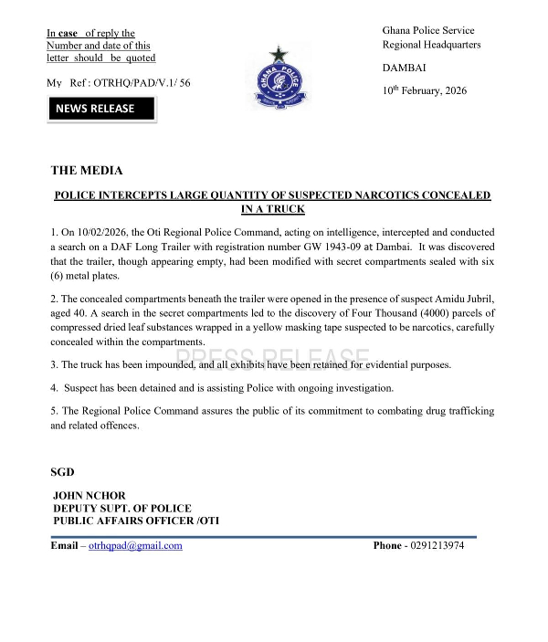 “On 10/02/2026, the Oti Regional Police Command, acting on intelligence, intercepted and conducted a search on a DAF Long Trailer with registration number GW 1943-09 at Dambai. It was discovered that the trailer, though appearing empty, had been modified with secret compartments sealed with six (6) metal plates,” the statement indicated.