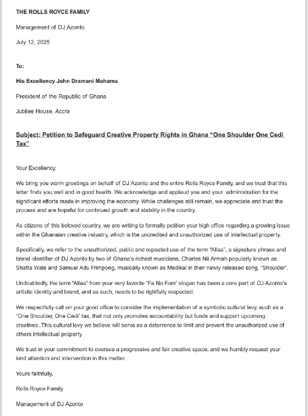 “As citizens of this beloved country, we are writing to formally petition your high office regarding a growing issue within the Ghanaian creative industry: the uncredited and unauthorized use of intellectual property,” excerpts from the letter read.
