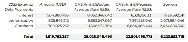 The table above summarises our external debt service position as at mid-December 2025. What it tells us is that our ability to reverse the trajectory of the Ghana cedi from a projected year average of Ghs15.95 to a realised average of GHs12.53 has saved the Ghanaian economy over GHS6.2billion. At year-end closing rates, this saving is USD560mn. This is not a profit but an economic benefit from GOLGBOD policy actions. As stated earlier, in economic policy terms, we focus on policy benefits and costs and not profits or losses.