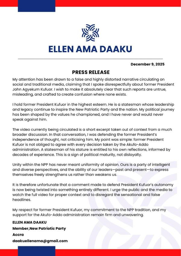 “I hold President Kufuor in high esteem. He is a statesman and someone whose leadership and legacy continue to inspire the New Patriotic Party and the nation. My political journey has been shaped by the values he championed, and I have never and would never speak against him,” the statement read.