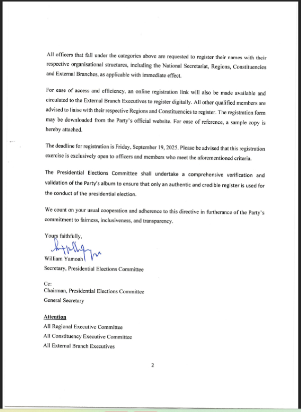 In a statement signed by william Yamoah, Secretary of the Presidential Elections Committee, on August 26, 2025, the party explained that the decision follows Article 13(1)(11) of its constitution and the transitional provisions adopted at the National Annual Delegates Conference held in Accra on July 19, 2025.