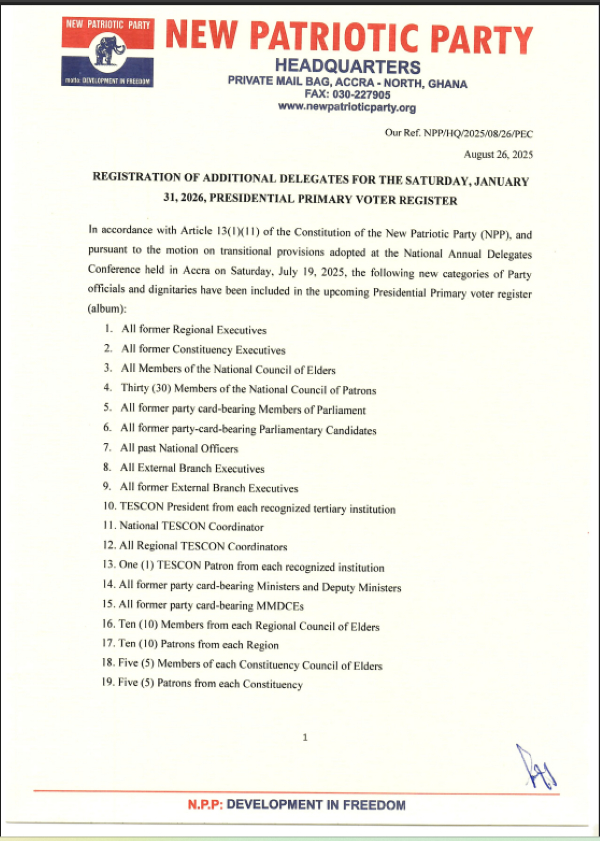The New Patriotic Party (NPP) has officially announced the start of registration of additional delegates for the party’s pending presidential primary scheduled for Saturday, January 31, 2026.