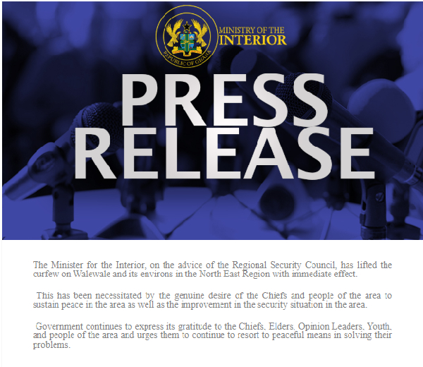The Ministry of the Interior has announced the lifting of the curfew imposed on Walewale and neighboring communities in the North East Region.