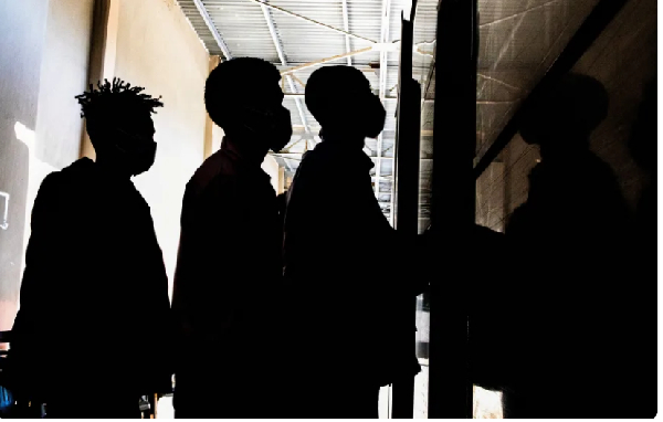 Newly arrived migrants line up inside a municipal hall in the town of Agyia, on the Greek island of Crete, on July 13, 2025