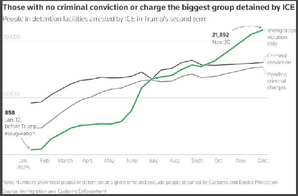 Some 41% of the roughly 54,000 people arrested by ICE and detained by late November had no criminal record beyond a suspected immigration violation, agency figures show. In the first few weeks in January, before Trump took office, just 6% of those arrested and detained by ICE were not facing charges for other crimes or were previously convicted.