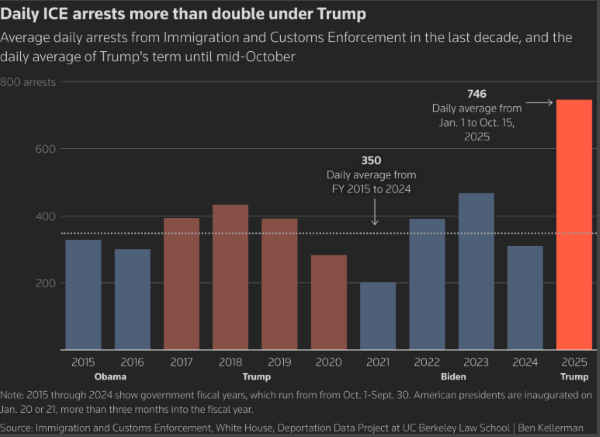 Bar chart showing average daily arrests by Immigration and Customs Enforcement from the years 2015 to 2024, and average daily arrests in the Trump administration in 2025, showing that arrests under Trump have more than doubled.