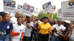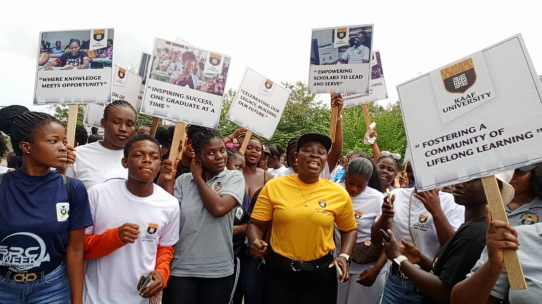 The float, which saw a procession of ecstatic students from their main campus in Budumburam through Kasoa to Tuba, formed part of the activities to celebrate KAAF's new status as a full-fledged university.