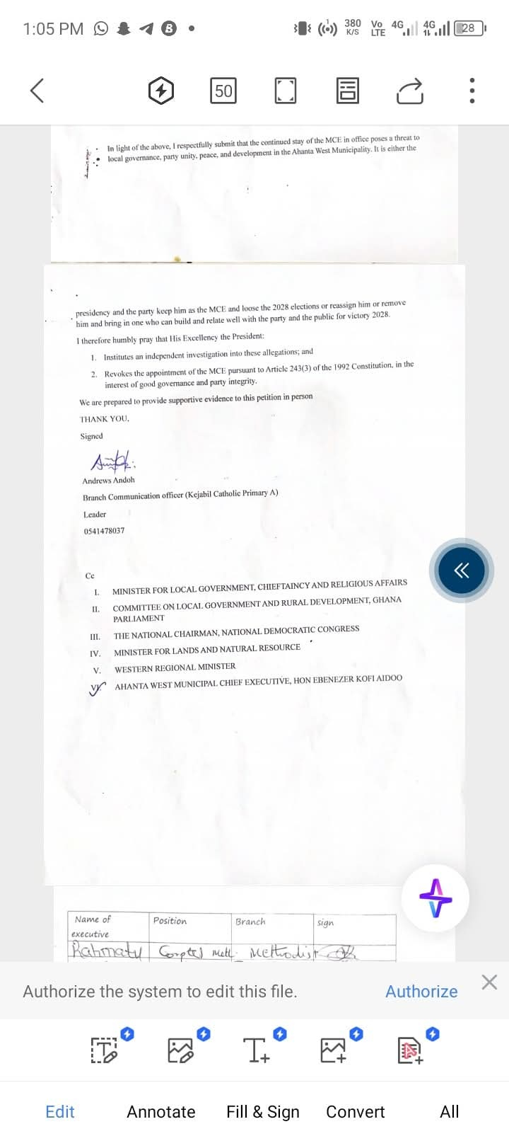 The petition claims the MCE locked the Municipal Assembly Hall to stop a scheduled meeting, bypassed key party executives and elected representatives in decision-making, and was allegedly involved in illegal mining activities despite publicly opposing them. Petitioners also accuse him of using security personnel for controversial operations involving intimidation and making unsubstantiated accusations against traditional leaders, straining community relations.