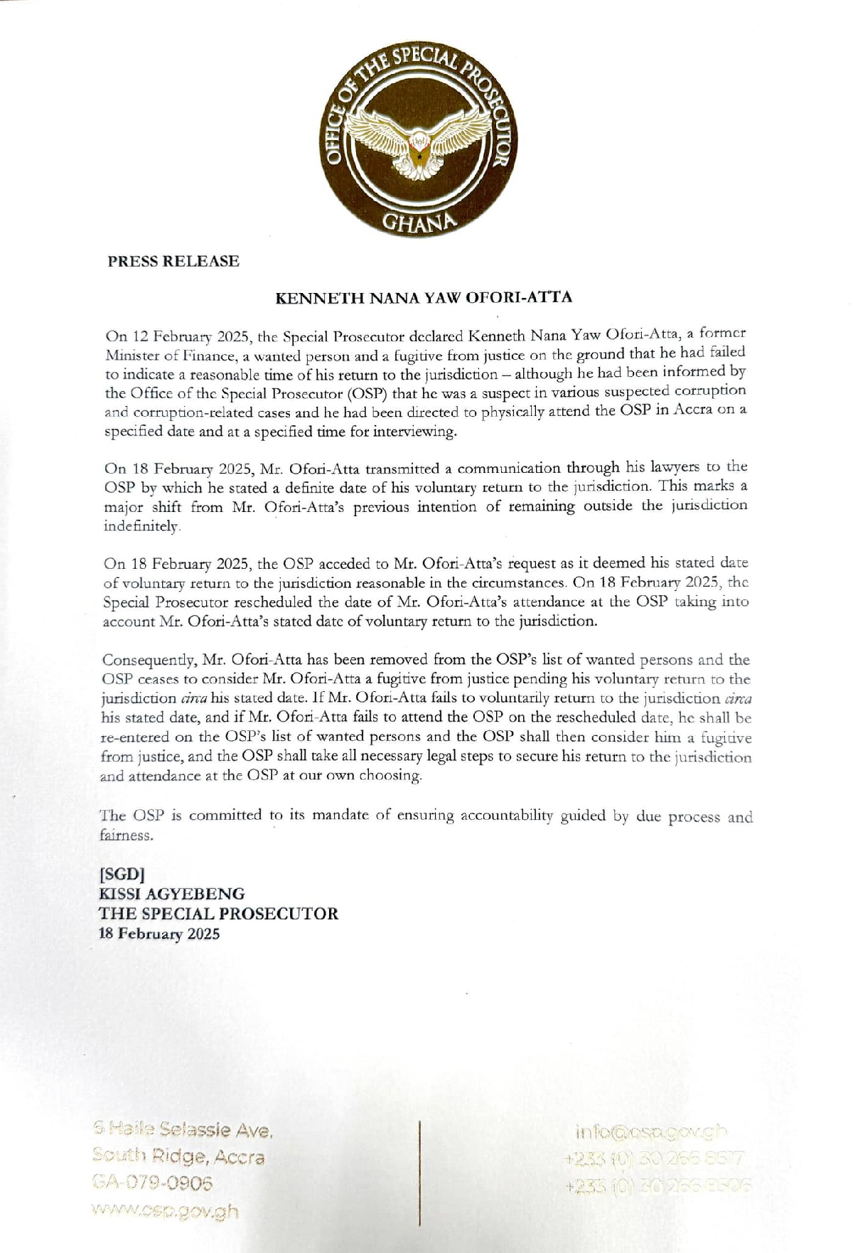 The OSP had initially declared Ofori-Atta wanted as part of an ongoing investigation into corruption-related offenses. However, with his confirmed return, the OSP has deemed it necessary to remove his name from the list.