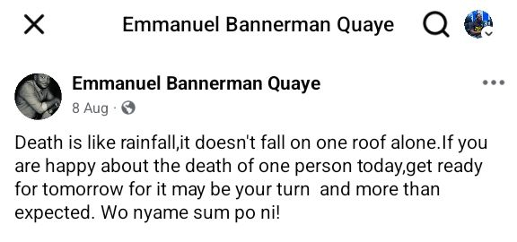 "Death is like rainfall, it doesn’t fall on one roof alone. If you are happy about the death of one person today, get ready for tomorrow for it may be your turn and more than expected. Wo nyame sum po ni!”