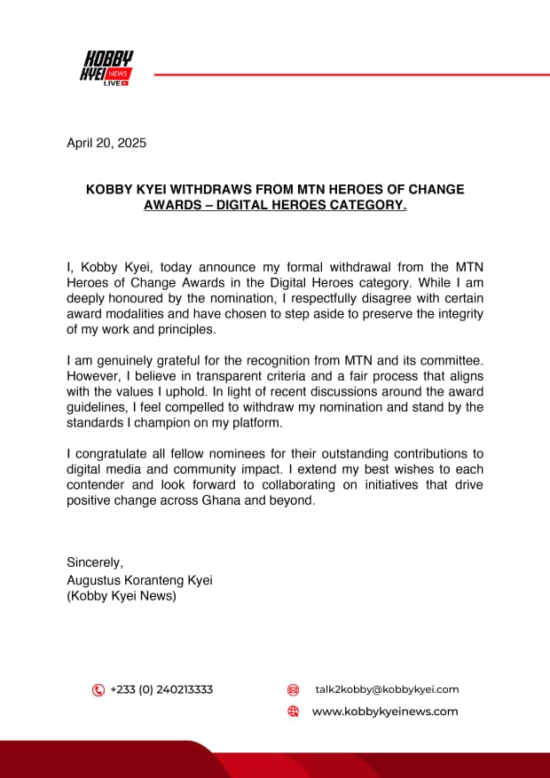 Online journalist and youth empowerment advocate Kobby Kyei has announced his withdrawal from the MTN Heroes of Change Awards in the Digital Heroes category.