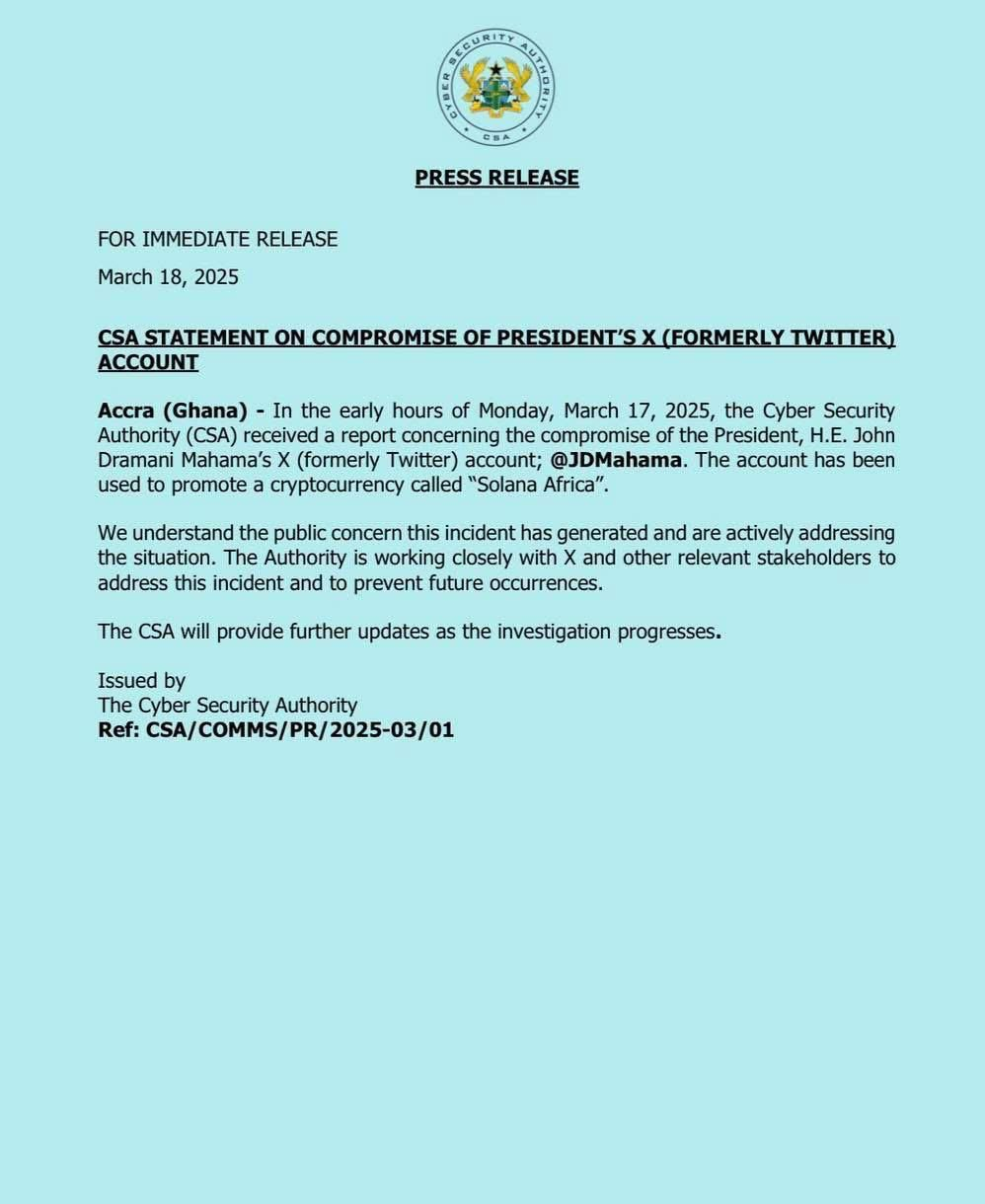 The Cyber Security Authority (CSA) claims that President John Dramani Mahama's official X account has been compromised.