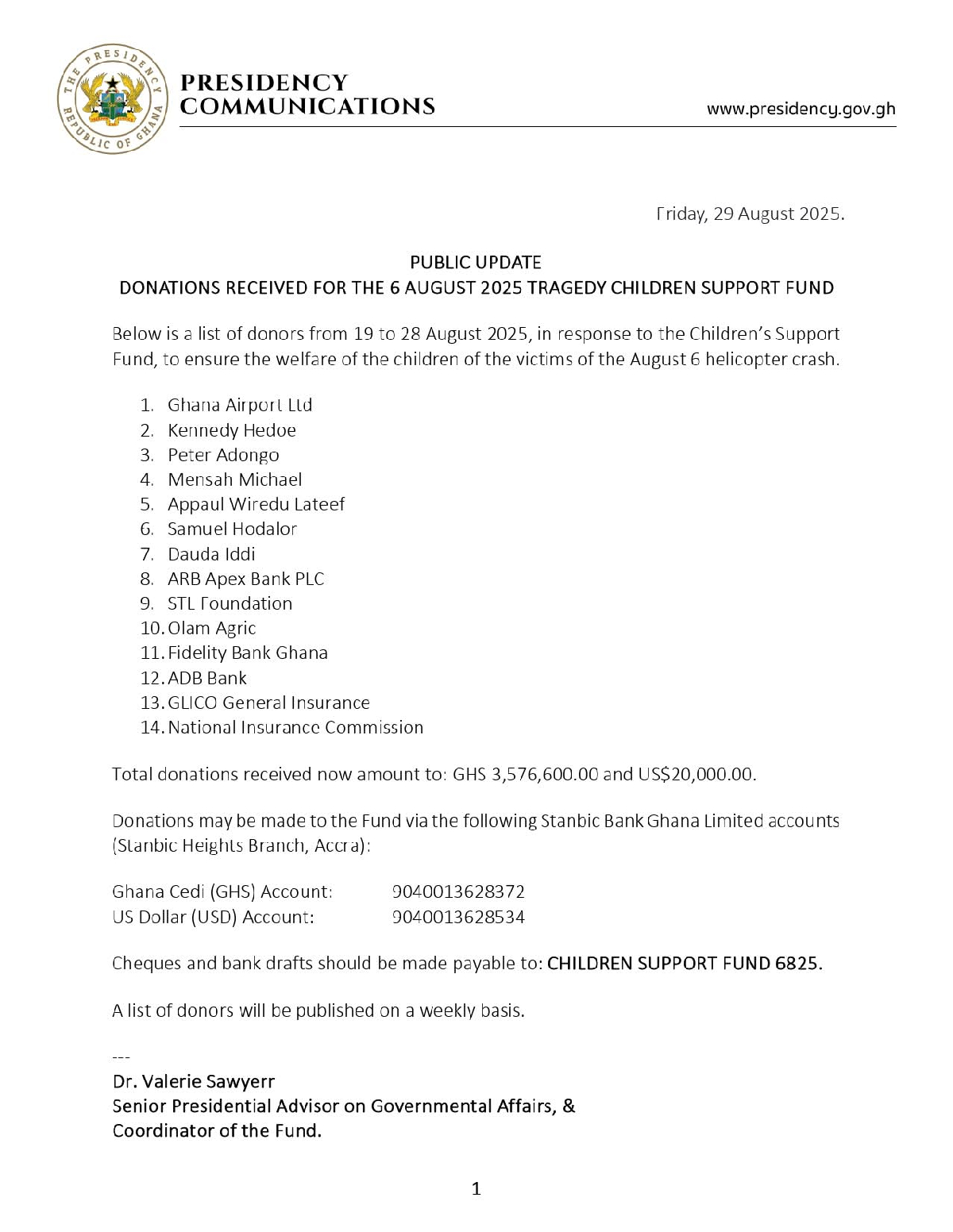 The Presidency has disclosed that a total of GHS 3,576,600.00 and US$20,000.00 has so far been received in donations towards the Children Support Fund, established to cater for the welfare and education of the children of victims of the tragic August 6 military helicopter crash.