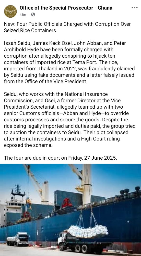 Issah Seidu, a staff member of the National Insurance Commission, James Keck Osei, a former Director at the Vice President's Secretariat, John Abban, and Peter Archibold Hyde, two senior Customs officials, are accused of conspiring to hijack the rice shipment, which was imported from Thailand in 2022.