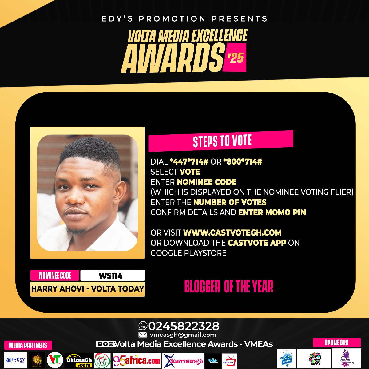 The vibrant digital media scene in the Volta Region has reasons to celebrate as renowned Political, lifestyle and entertainment blogger, Harry Ahovi, popularly known as Prince Harrylord secures a prestigious nomination for Blogger of the Year at the highly anticipated Volta Media Excellence Awards (VMEA) 2025.