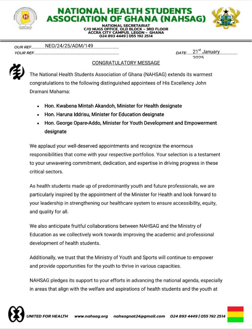 The current leadership of the National Health Students Association of Ghana (NAHSAG), under the visionary guidance of H.E. Ernest Agyare (Obama), issued a press statement today, January 21, 2025, extending warm congratulations to the newly appointed honorable ministers designate for Health, Education, and Youth Development and Empowerment.