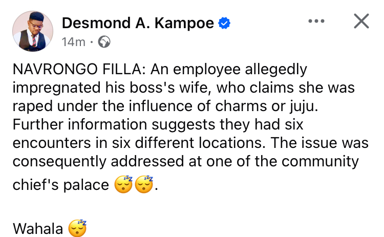 According to a well known philanthropist and lecturer Desmond Kampoe, an employee stands accused of impregnating his boss’s wife, who claims she was raped under the influence of *juju* (charms) during six alleged encounters across multiple locations.