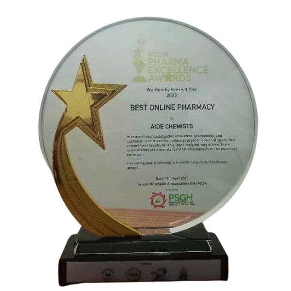 Aide Chemists has been awarded Best Online Pharmacy in Ghana by the Pharmaceutical Society of Ghana (PSGH) at the 2025 Pharma Excellence Awards held at the Mövenpick Ambassador Hotel in Accra. The honour, presented in the presence of key stakeholders and the Honourable Minister of Health, recognises Aide Chemists’ outstanding contribution to digital pharmaceutical service delivery in Ghana.