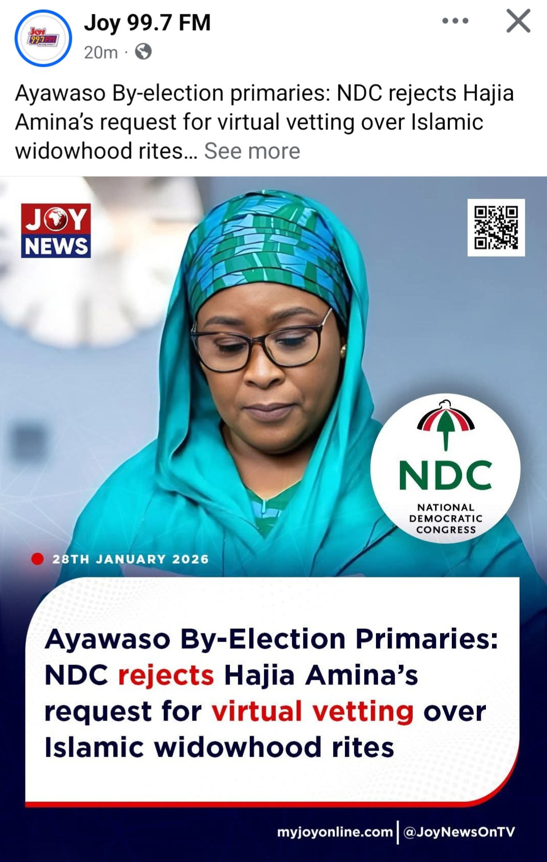 JoyNews reported on Wednesday, January 28, 2026, that Hajia Amina Adam's plea to be virtually screened prior to the Ayawaso East by-election primaries was denied by the National Democratic Congress (NDC). In accordance with party regulations, the party demands that all candidates go through the screening procedure in person.