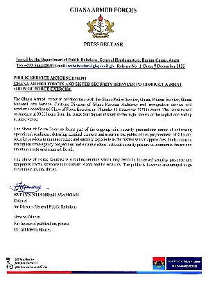 The Ghana Armed Forces (GAF), in partnership with several national security institutions, will on Thursday, 11th December 2025, conduct a large-scale Show of Force Exercise across major streets of Accra.