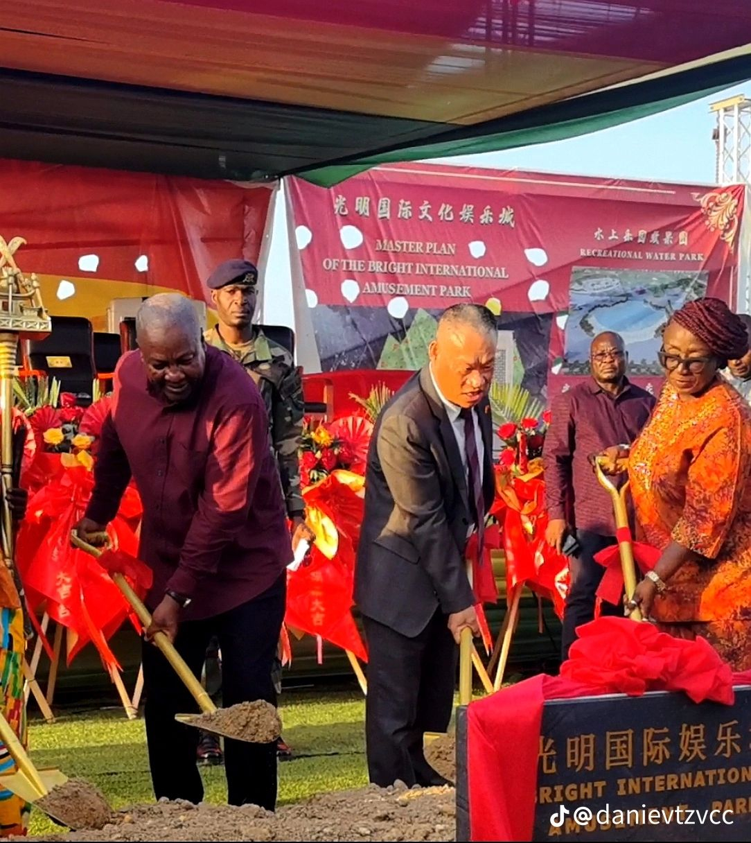 President John Dramani Mahama on Saturday 9th October 2025, joined the Greenhouse Group Chairman, Mr. Zheng Xiangming, in Afienya, Tema to perform a groundbreaking sod-cutting ceremony at the premises of the company, to officially open the $300 Million Dollar investment sitting on a 500-Acre land, Bright International Freezones Amusement Park, to the general public and investors.