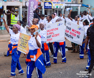 Led by the Jospong Group's Chaplain, Reverend Peter Nelson Adu, and staff members, they defied the morning rains to spread the gospel to residents within Adjirigarnor and its surroundings. They held placards some of which read: "In Him Is Life", "Salvation is Free", "The Lord Has Always Been Faithful", "Jesus Christ is The Salvation" among others.